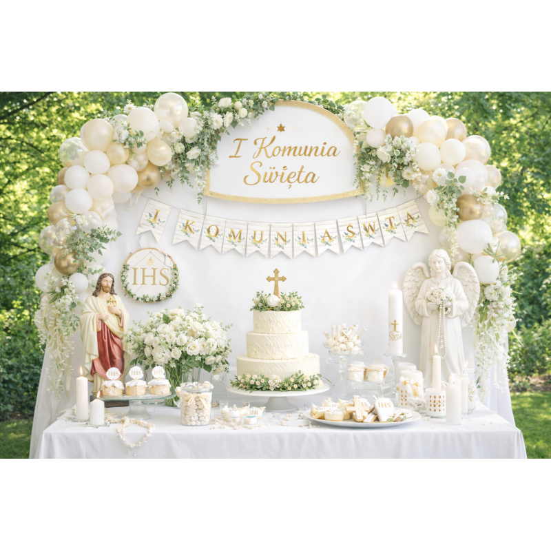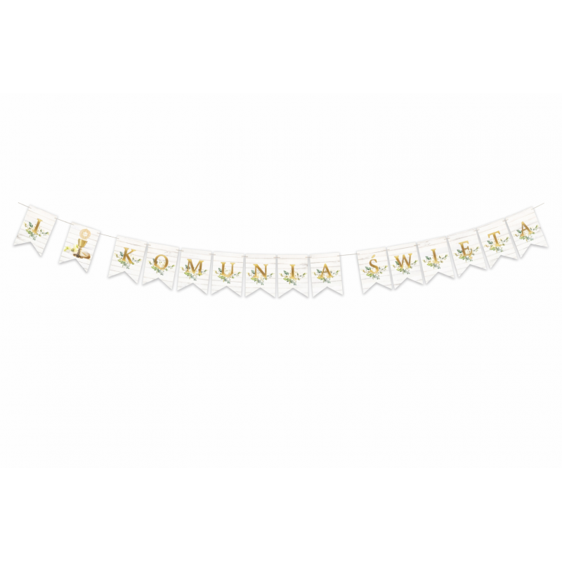 Girlanda komunijna tworząca napis Pierwsza Komunia Święta w biało - złotej kolorystyce. Taka dekoracja wspaniale podkreśli charakter uroczystości i świetnie prezentuje się na zdjęciach.