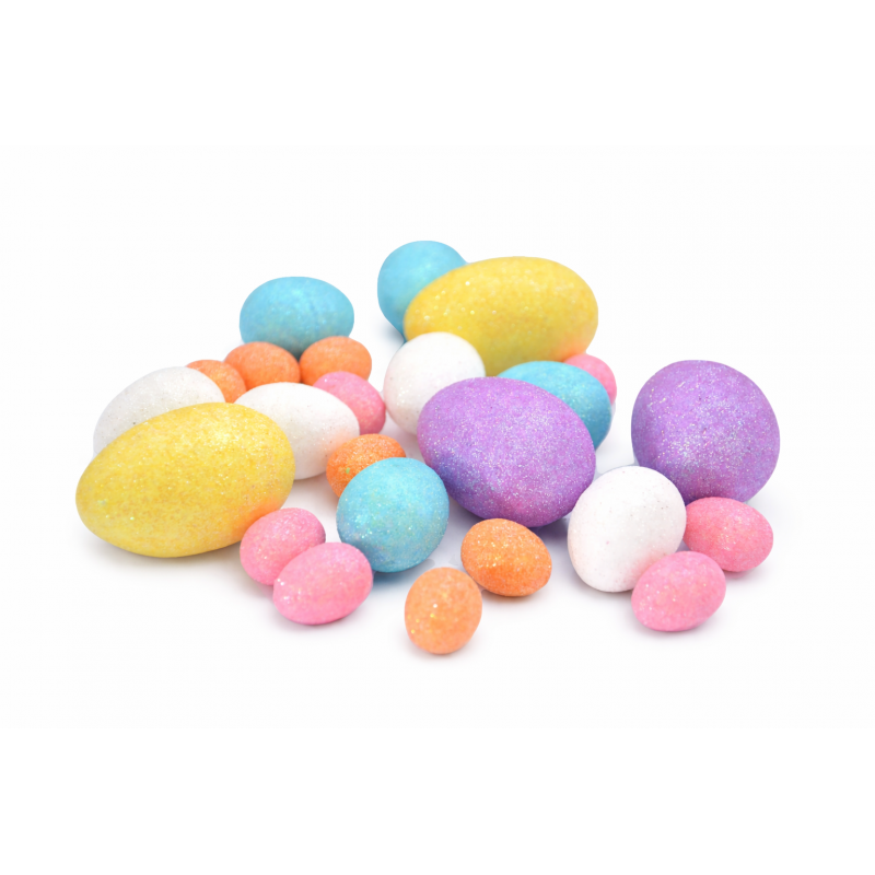 Jajeczka wielkanocne brokatowe, wykonane ze styropianu to lekka, którą można wykorzystać do stroików wielkanocnych.